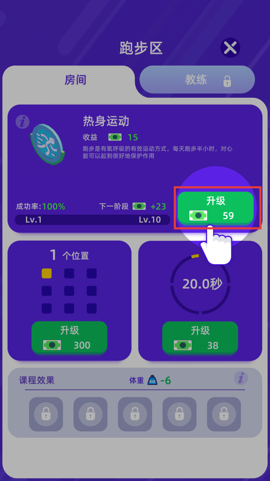 3、切换到跑步区,点击【热身运动】旁的【升级】按钮,强化跑步区课程收益呀。