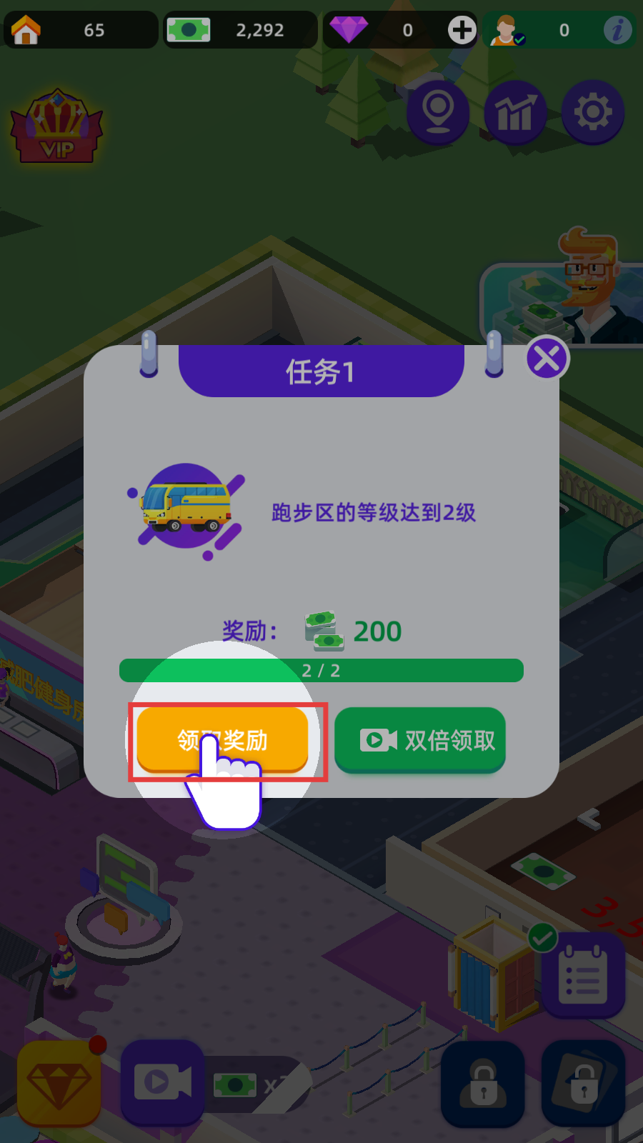 4、完成跑步区等级任务后,点击【任务1】的【领取奖励】按钮,获取200现金奖励咯,不断将健身房做大做强吧。