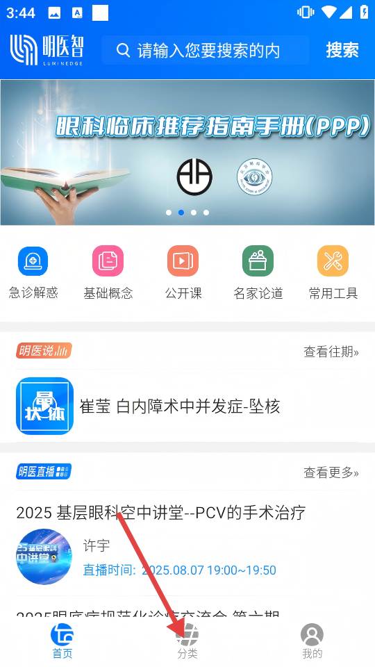 1、打开【明医智】首页,点击底部【分类】,进入眼科知识类目界面,筛选学习内容。