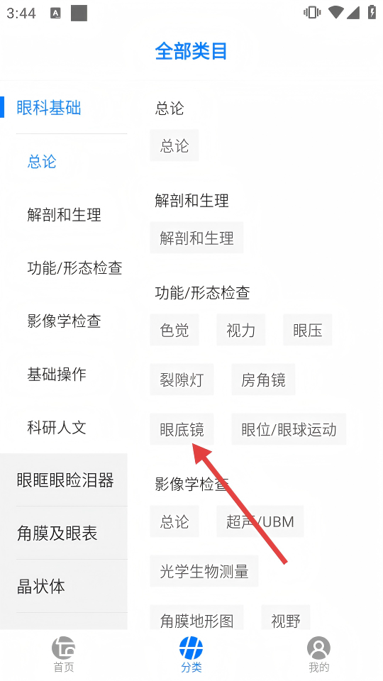 2、在【全部类目】中,选择【眼科基础-功能/形态检查-眼底镜】,定位专项学习板块。
