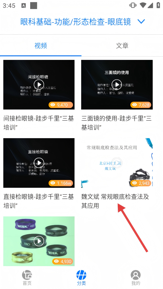 3、在眼底镜分类下,点击目标文章,进入学习详情页。