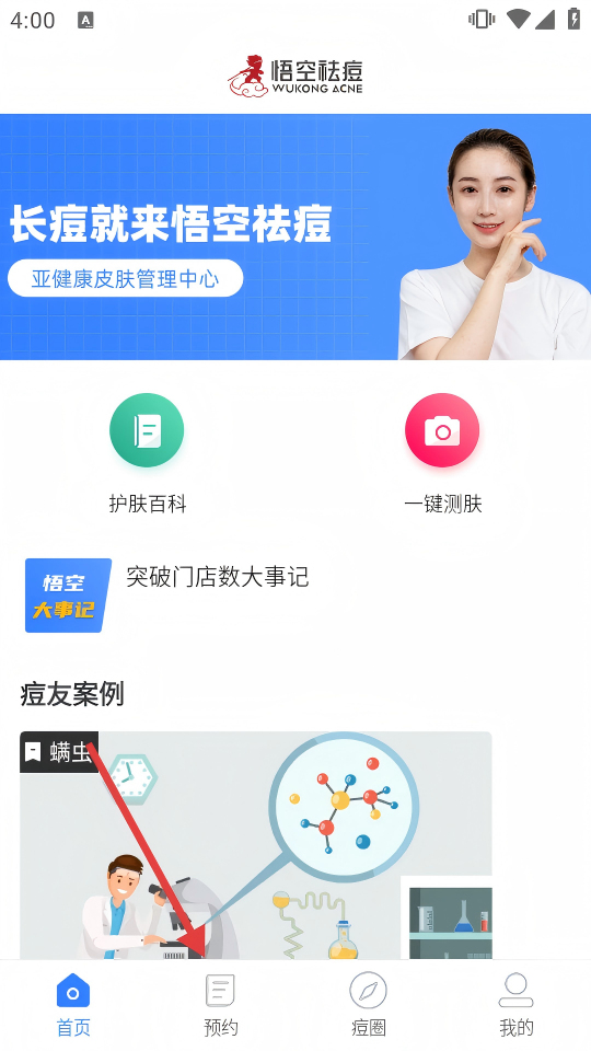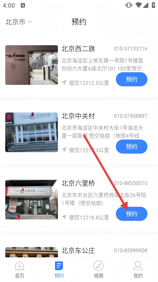 1、进入悟空祛痘首页,点击底部【预约】,跳转门店列表,开启北京区域祛痘服务预约。