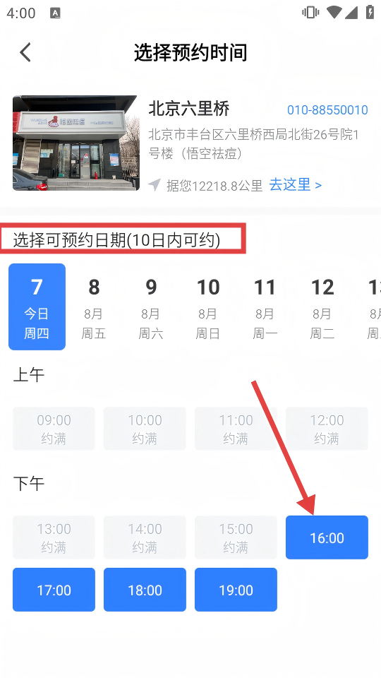 3、选择【10日内可约】日期,勾选下午【16:00】时段,确认预约,获取到店时间提醒。