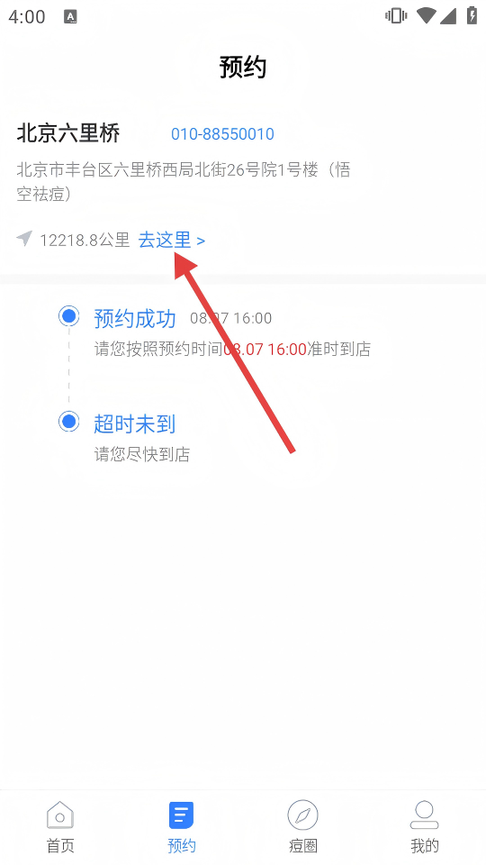 4、预约成功后,点击【去这里】,查看门店导航地址,按时前往北京六里桥悟空祛痘店。
