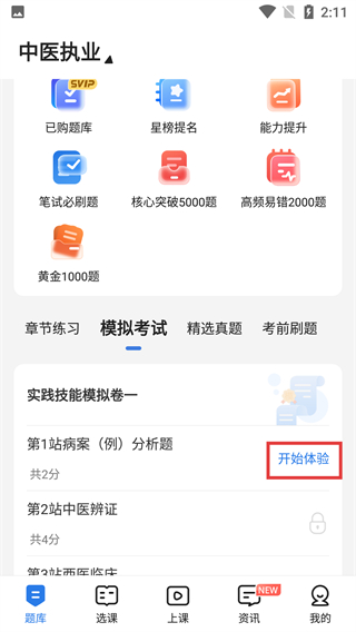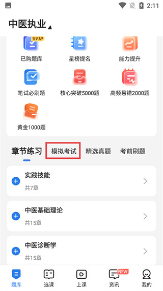 1、进入【中医执业】板块界面,可使用各类题库功能,点击【模拟考试】标签切换到对应练习板块。
