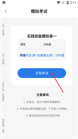 3、进入【模拟考试】准备页,查看【实践技能模拟卷一】的题型与注意事项,点击【开始考试】进入答题环节。