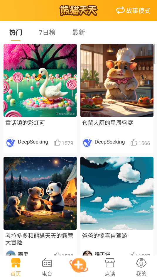 1、进入首页,可点播各种不同的语音故事,分有三个版块,热门故事,7日榜故事,最新故事。