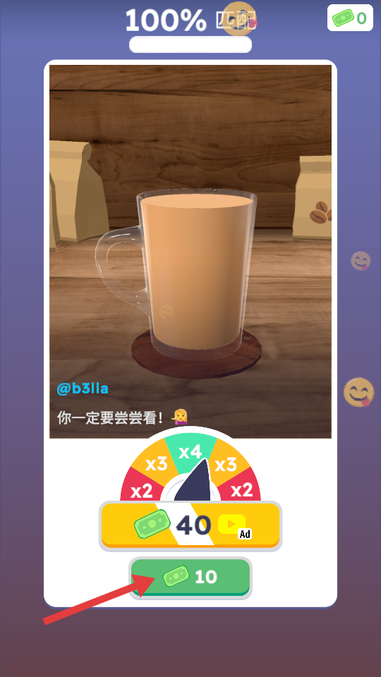 4、饮品制作完成后,点击绿色按钮,领取10货币奖励。