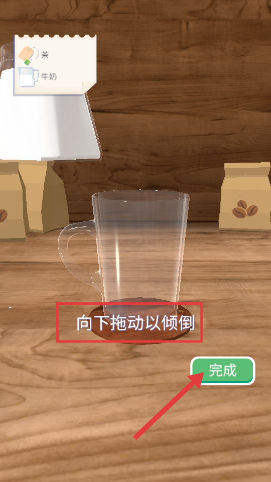 3、向下拖动杯子倾倒饮品,点击【完成】,制作指定饮品。