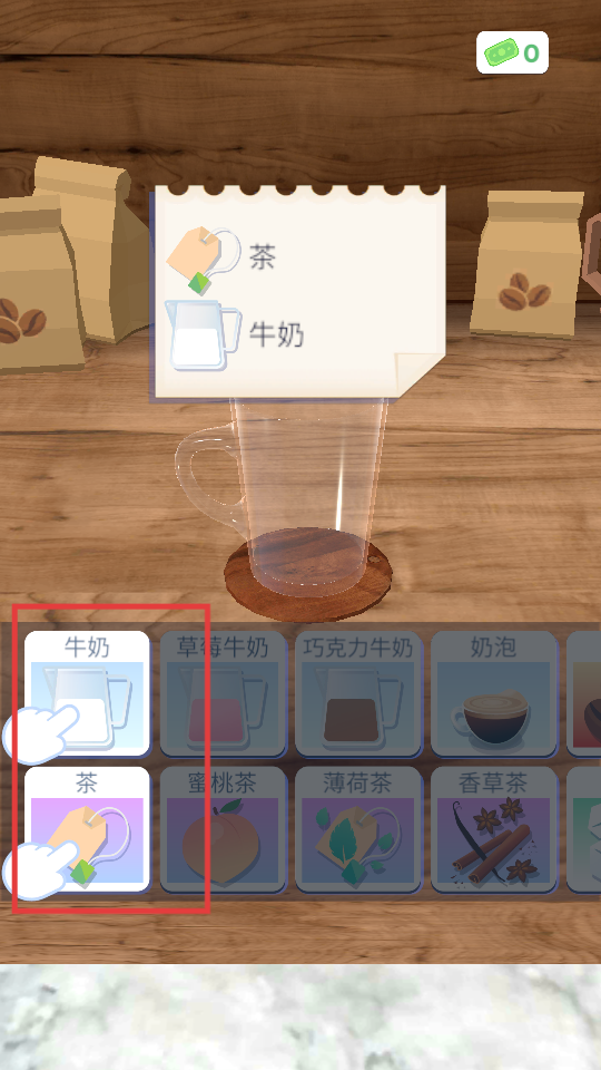 2、按提示依次点击【茶】【牛奶】,添加原料到杯子中。