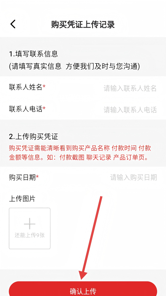 3、填姓名-电话-购买日期,上传凭证图,完善提交内容。