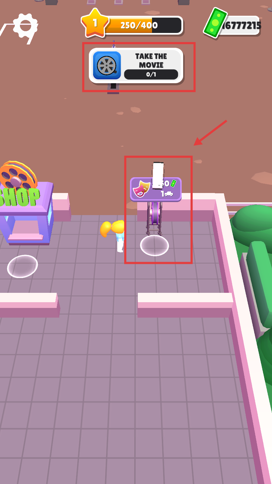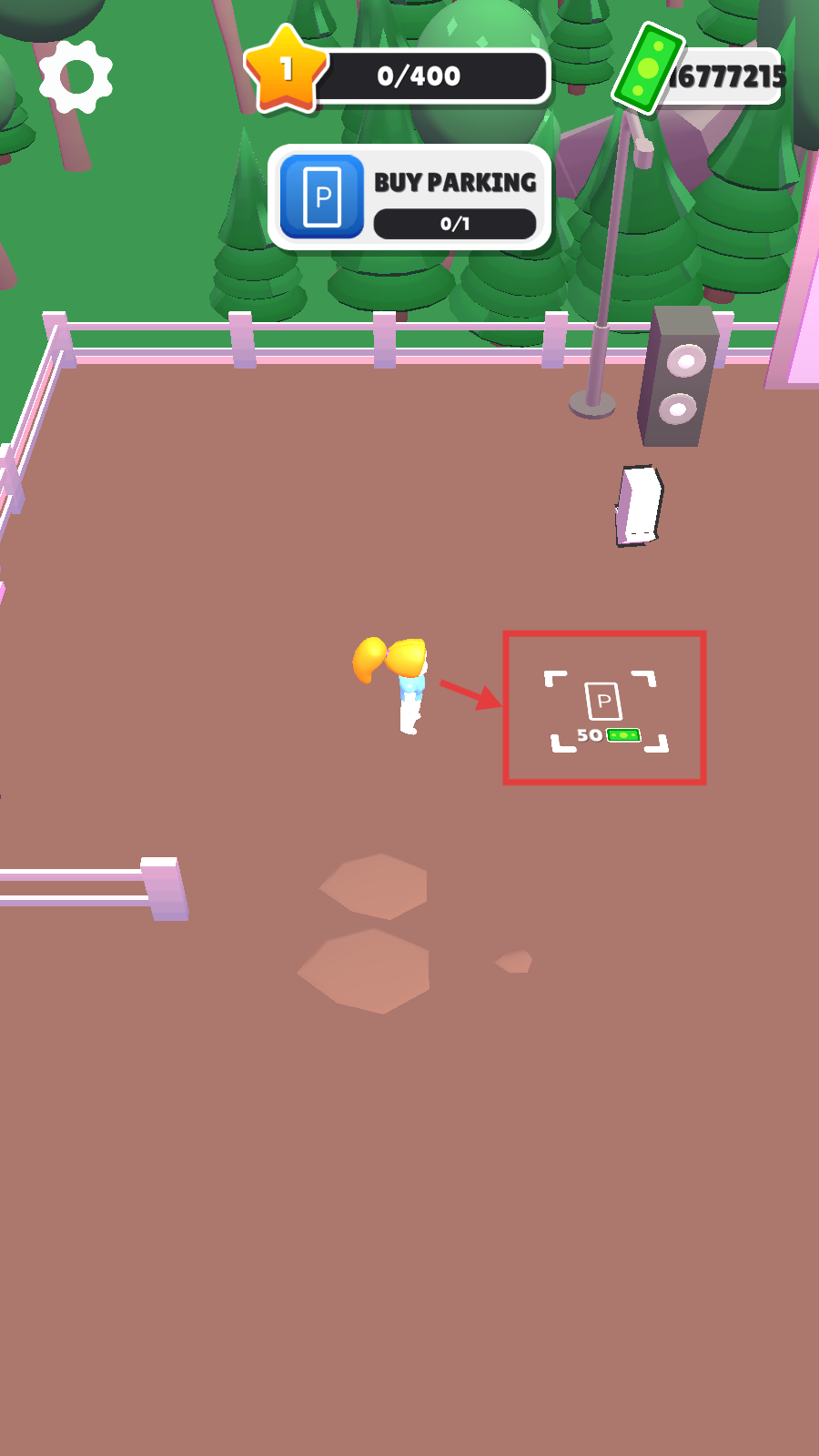 1、我们操控角色走到带有【P】标识的区域,花费50金币购买停车位,拓展影院设施。