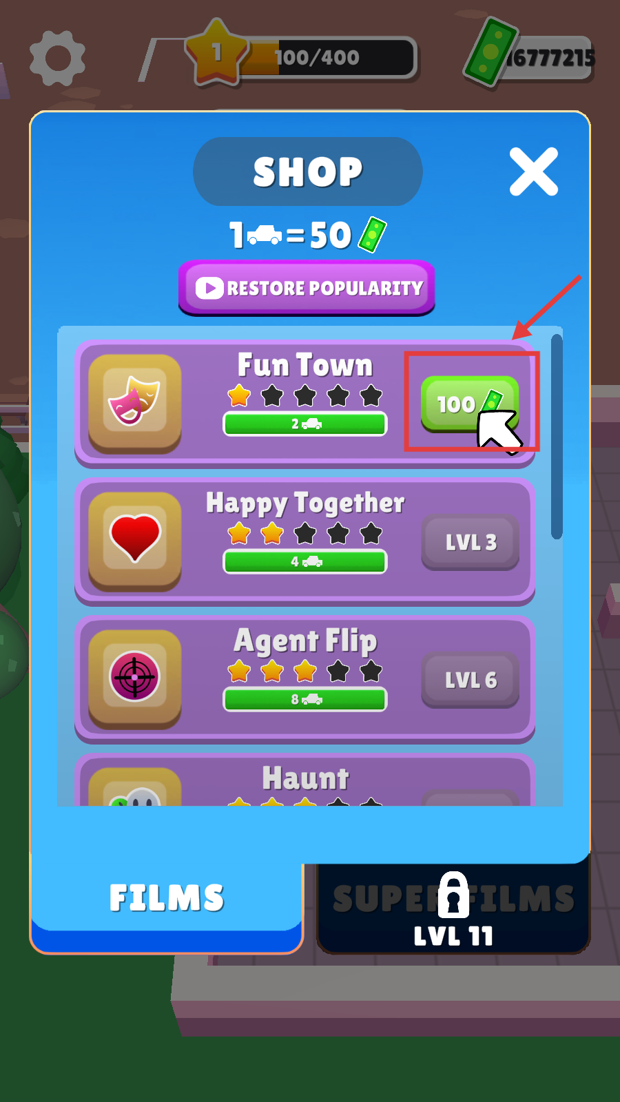 2、进入商店,花100金币解锁【FunTown】影片,丰富影院片源,吸引更多顾客。