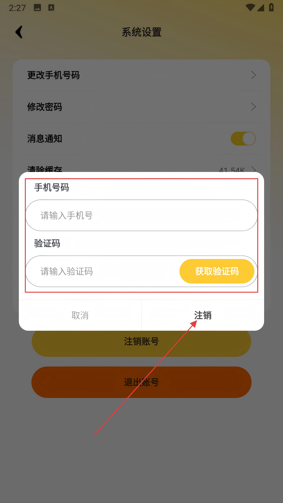 4、在弹出框填手机号、验证码,点击【注销】完成账号注销。