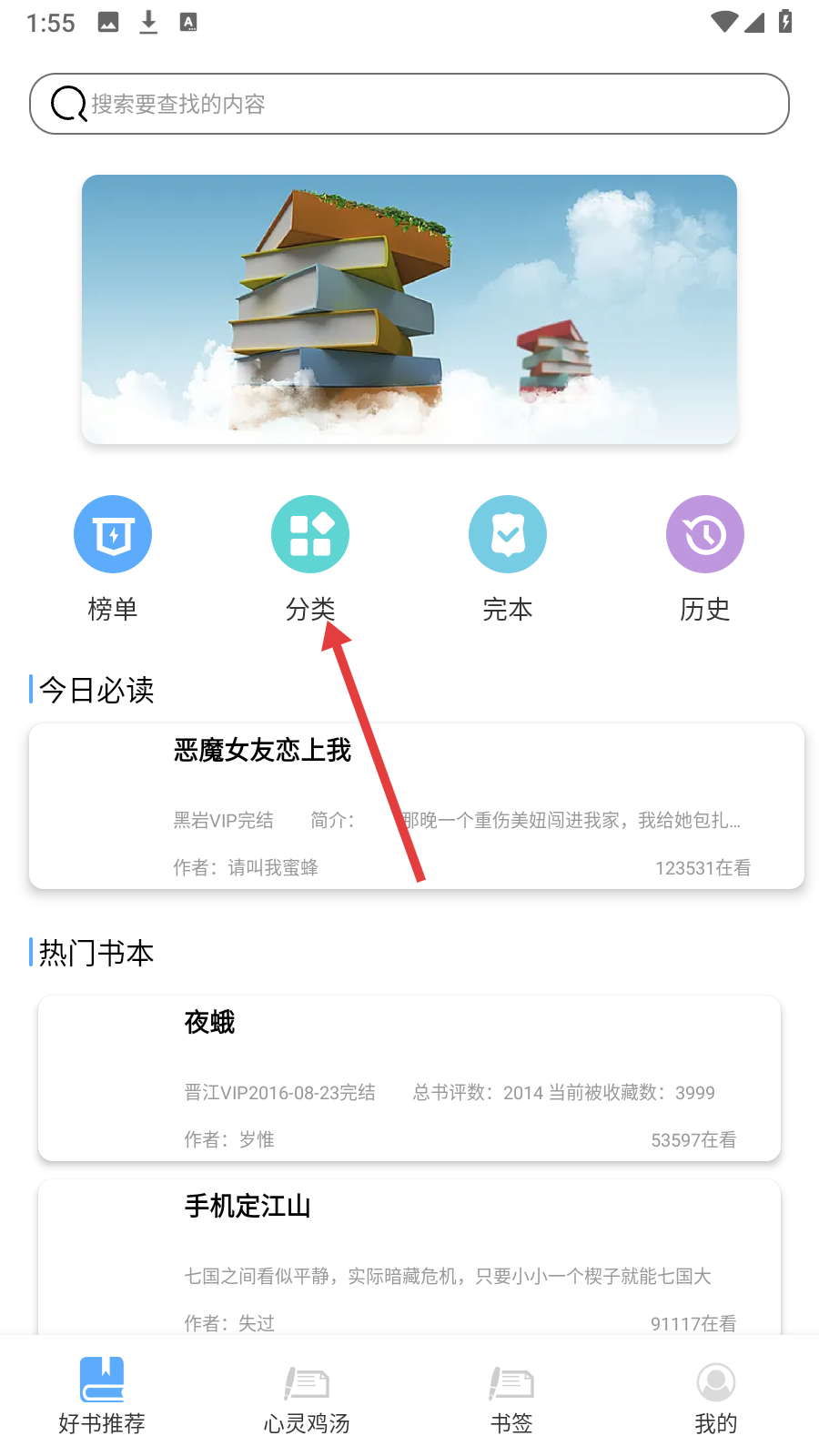 1、好书推荐页点击【分类】,进入书籍分类选择界面。