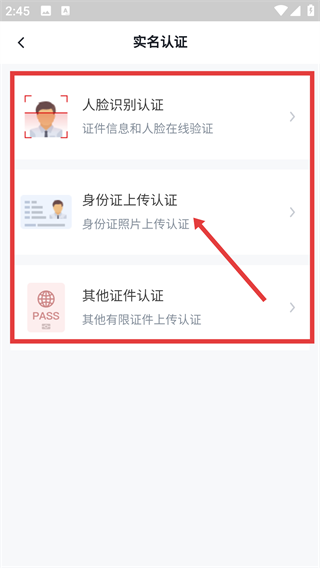 3、进入实名认证界面,选择【身份证上传认证】,准备上传身份证照片呢。