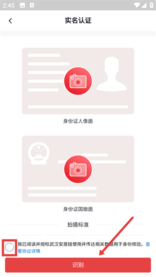 4、勾选协议,点击【识别】按钮,按提示拍摄身份证人像面和国徽面,完成实名认证啦。