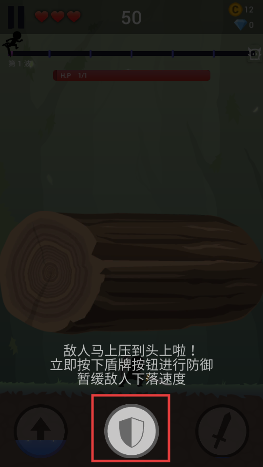 4、敌人下压时点击中间盾牌按钮,触发防御,暂缓敌人下落速度保障生存。