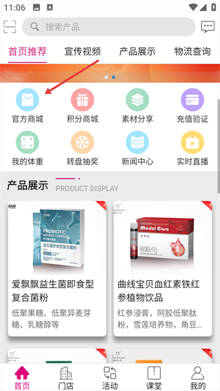 1、在app首页,点击“官方商城”选项,进入商城的商品展示页面。