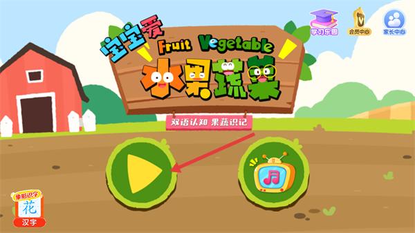1、点击主界面的黄色三角按钮,进入【宝宝爱水果蔬菜】的互动关卡,开启果蔬认知流程。