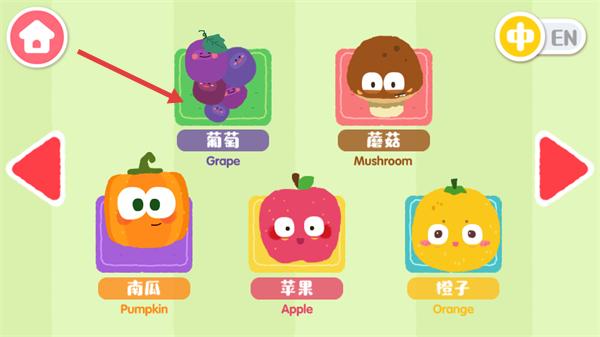 2、在果蔬选择界面点击【葡萄】选项,进入与葡萄相关的互动环节,进行果蔬认知学习。
