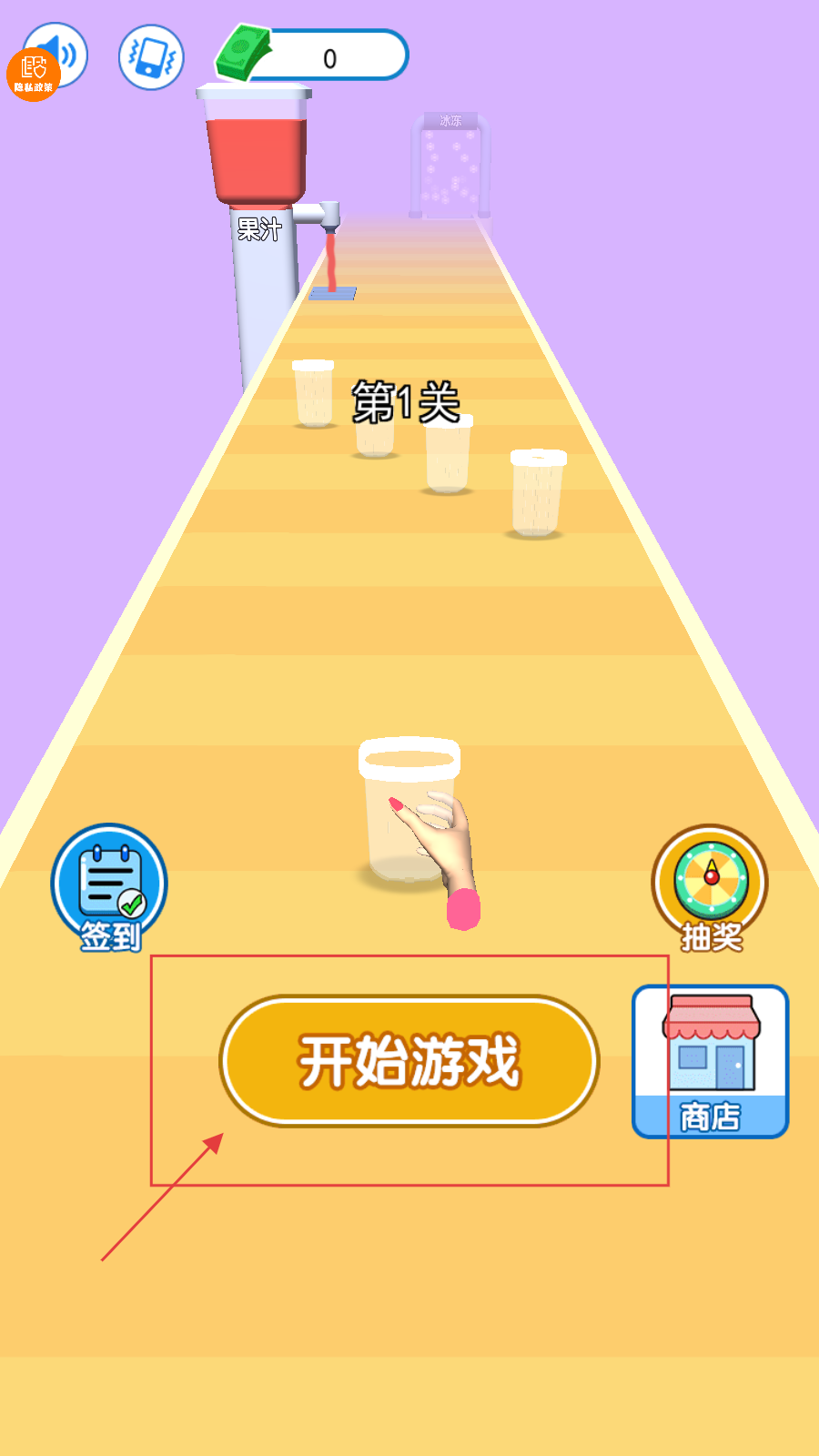 1、点击【开始游戏】,进入果汁接取关卡,准备操作杯子接果汁。