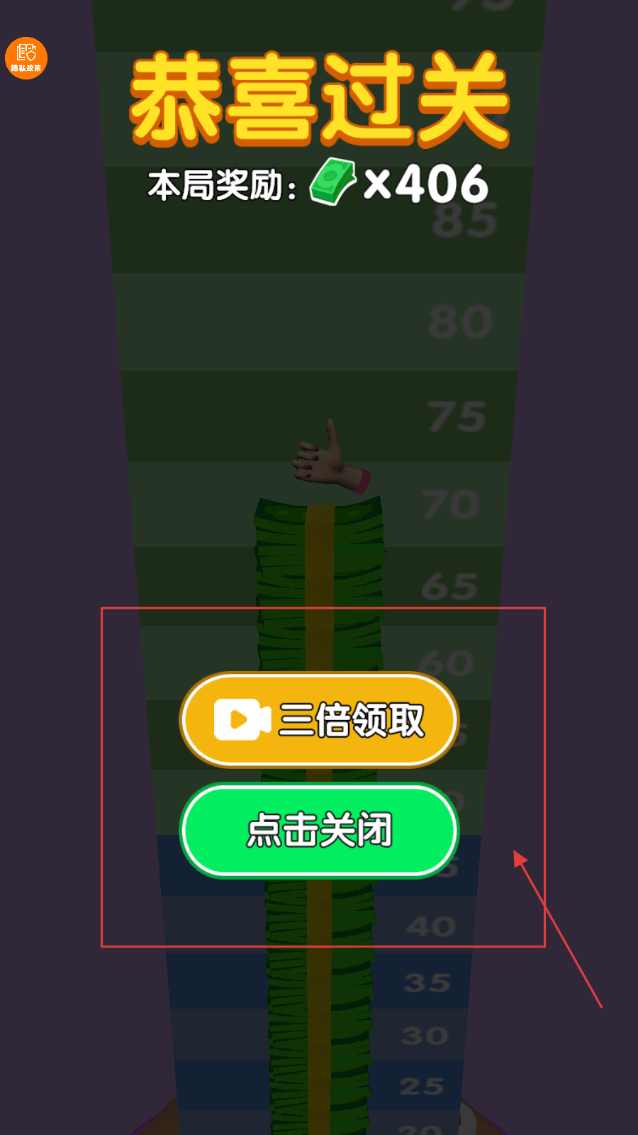 4、通关后选【点击关闭】或看广告【三倍领取】奖励,继续下一关。