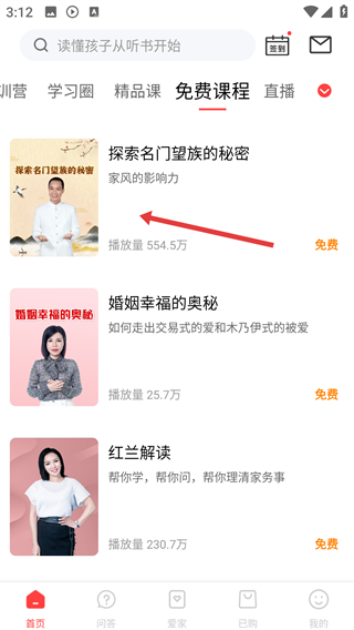 1、打开【家慧库】软件,在【免费课程】栏选想听的课程进入内容页呢。