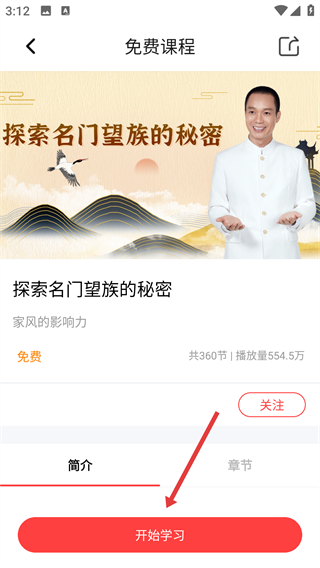 2、进入【探索名门望族的秘密】课程详情页,点击【开始学习】按钮进入播放界面呀。