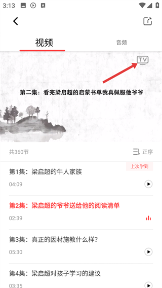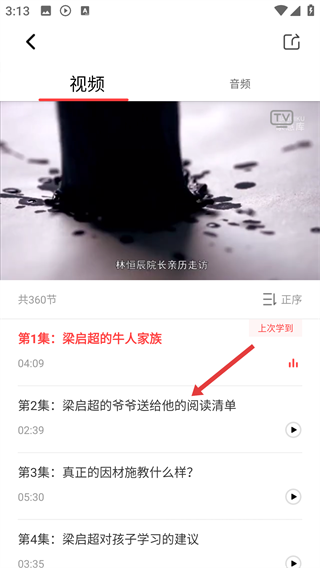 3、在【探索名门望族的秘密】播放页章节列表,选对应课程章节开始播放哦。
