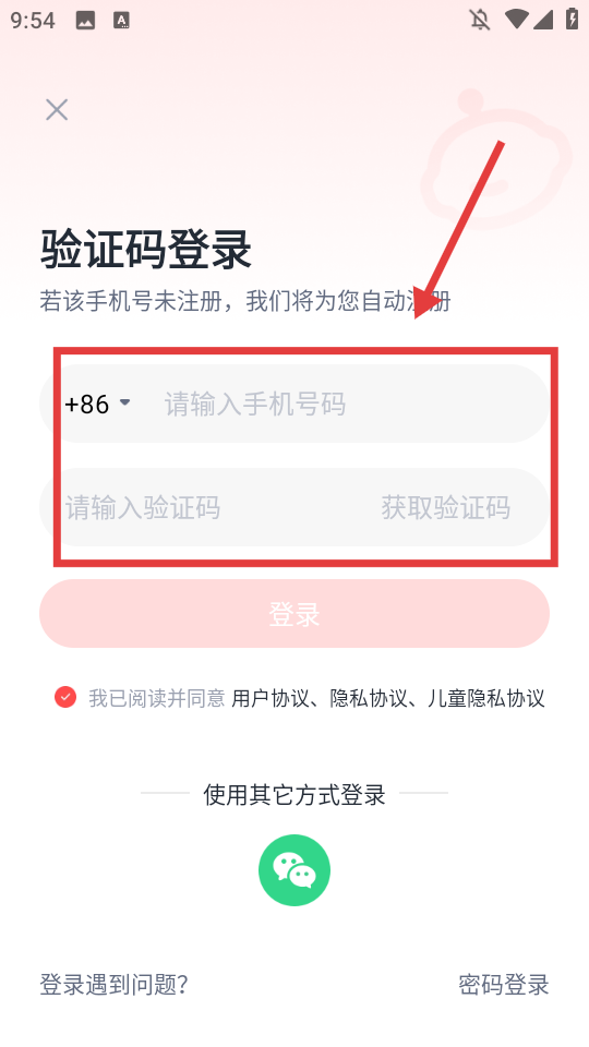 3、选择【验证码登录】,输入手机号码和验证码。