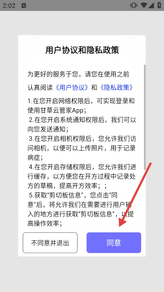 1、阅读【用户协议和隐私政策】内容后,点击【同意】按钮,授权权限并进入App。