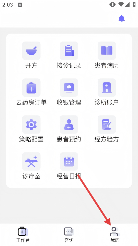2、进入工作台界面,点击底部导航栏【我的】,进入个人账号操作页面。