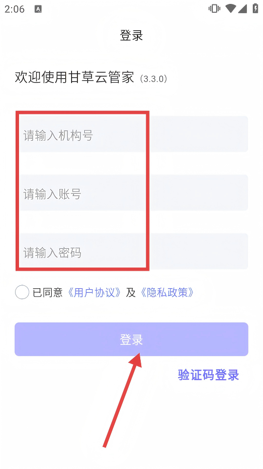 4、依次填写【机构号-账号-密码】,勾选协议后,点击【登录】按钮完成账号登录。