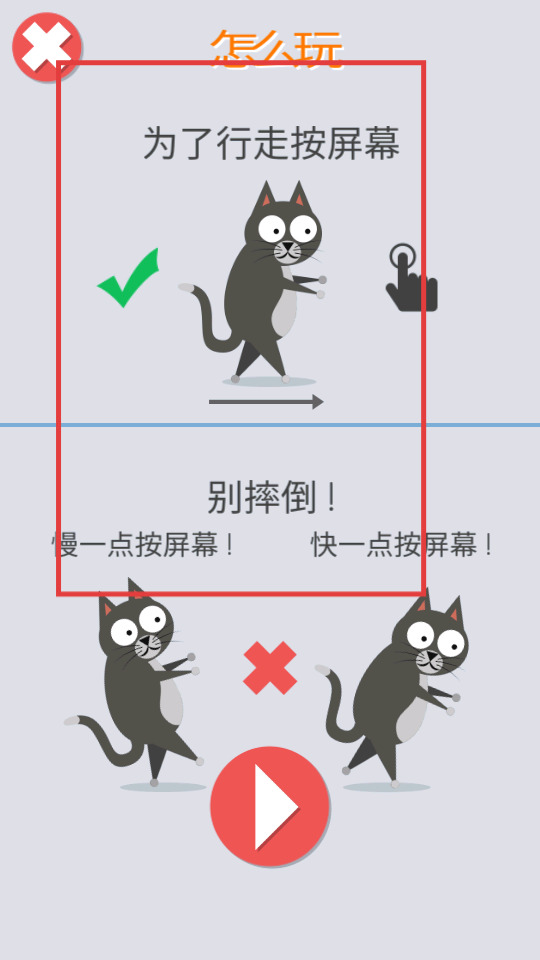 2、跟随教程,按屏幕控制猫咪行走,把握点击节奏,避免摔倒,熟悉操作规则。