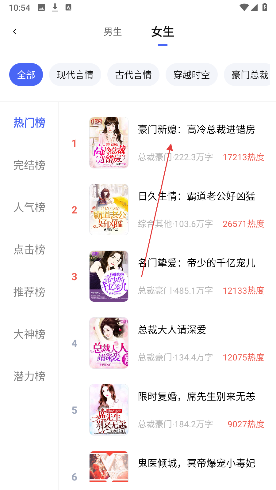 2、在女生热门榜选【喜欢的书籍】,进入详情页。