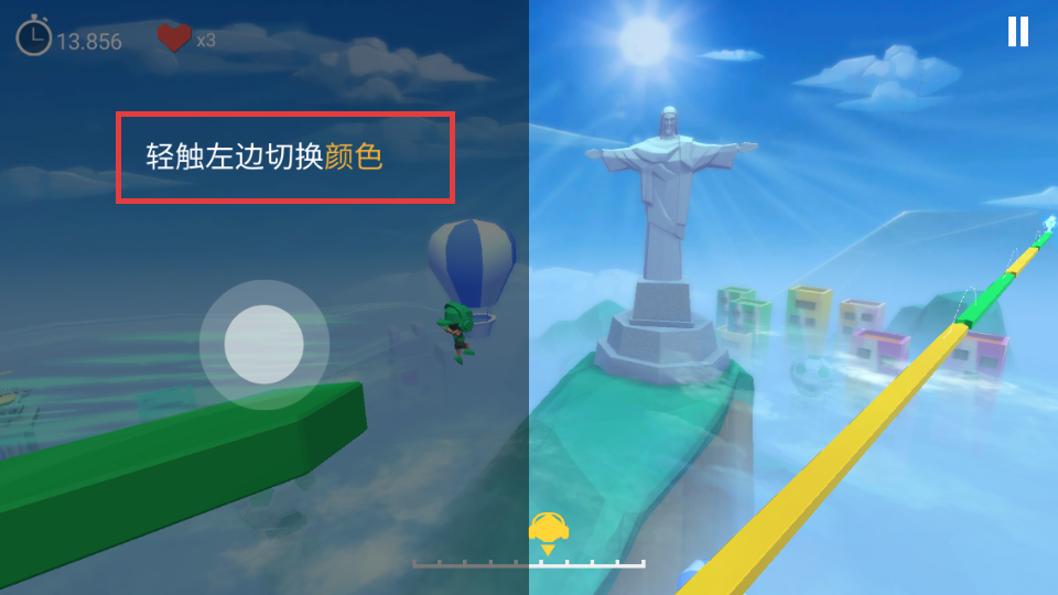 3、面对颜色道路,【轻触左边切换颜色】,使角色颜色匹配道路,顺利通过不同路段。