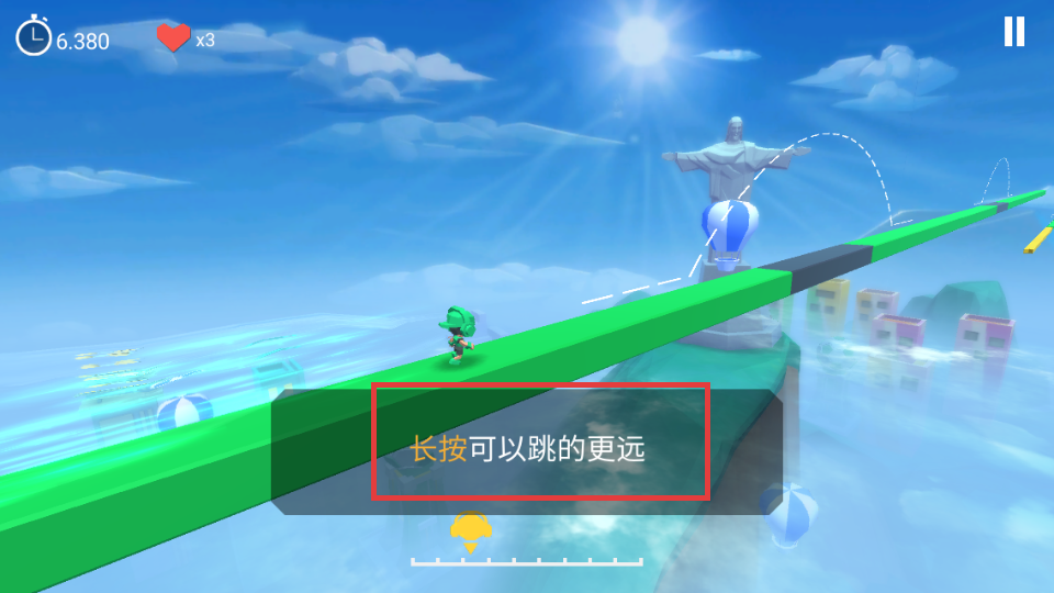 2、遇长距离间隙,【长按可以跳的更远】,通过长按右侧操作,实现更远跳跃距离。