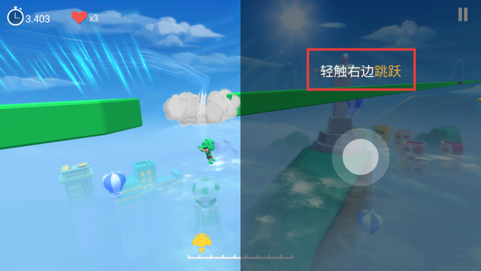 1、游戏中按提示【轻触右边跳跃】,助角色跨越绿色道路缺口,把握跳跃时机前行。