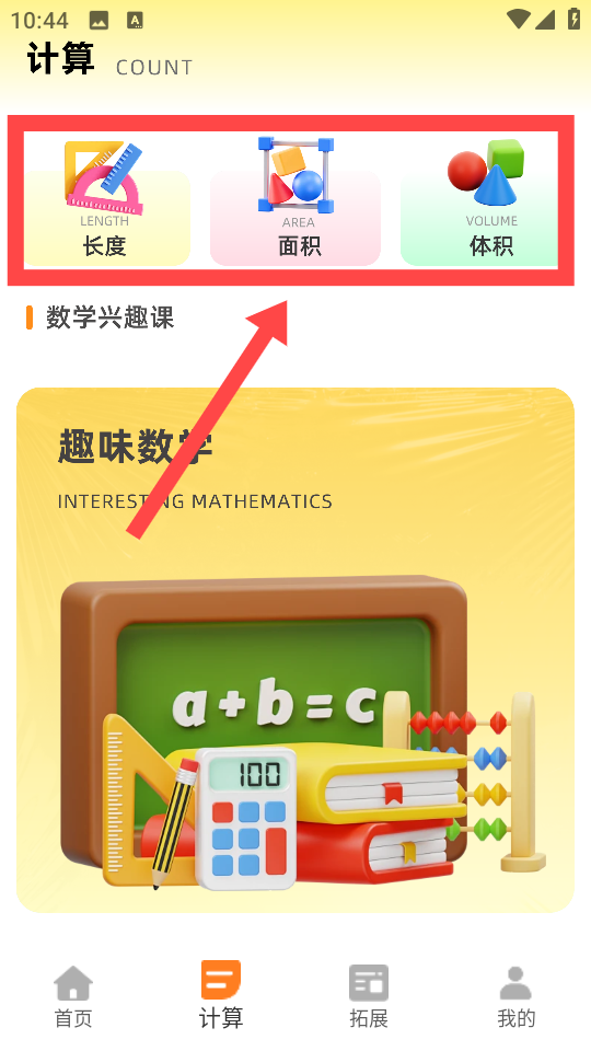 2、在计算页,选择【长度】【面积】【体积】任一模块,进入单位换算界面。