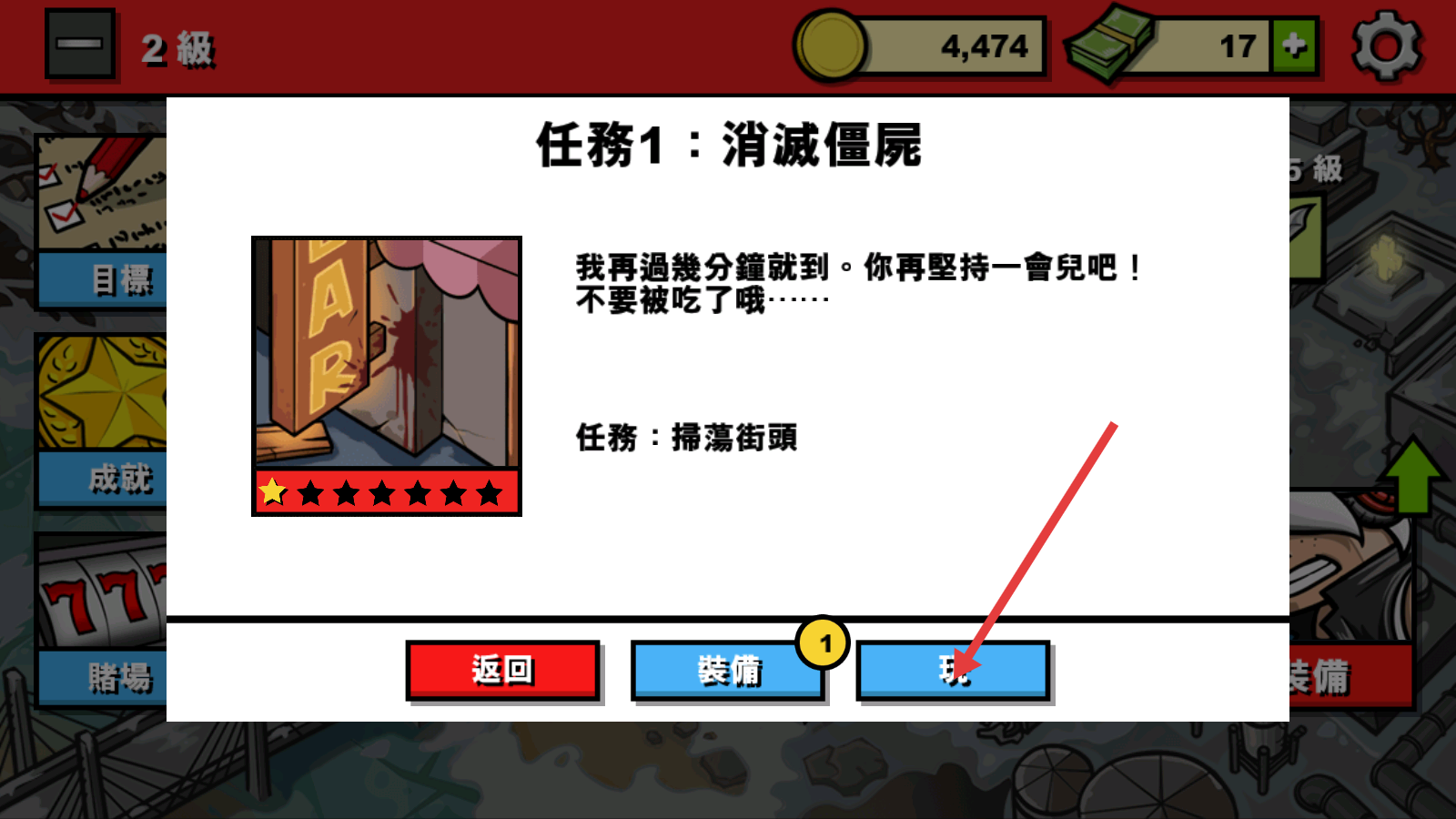 1、在任务界面选择【任務1:消滅僵屍】-点击【玩】按钮,进入街头僵尸讨伐战。