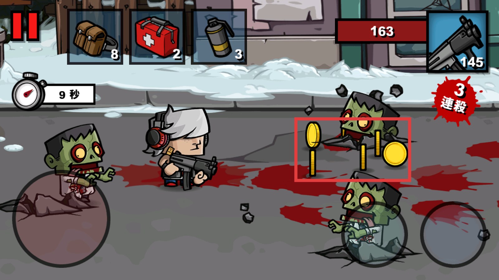 2、左侧圆盘摇杆控制角色移动-右侧按键触发射击,瞄准靠近的僵尸持续输出,注意弹药消耗。