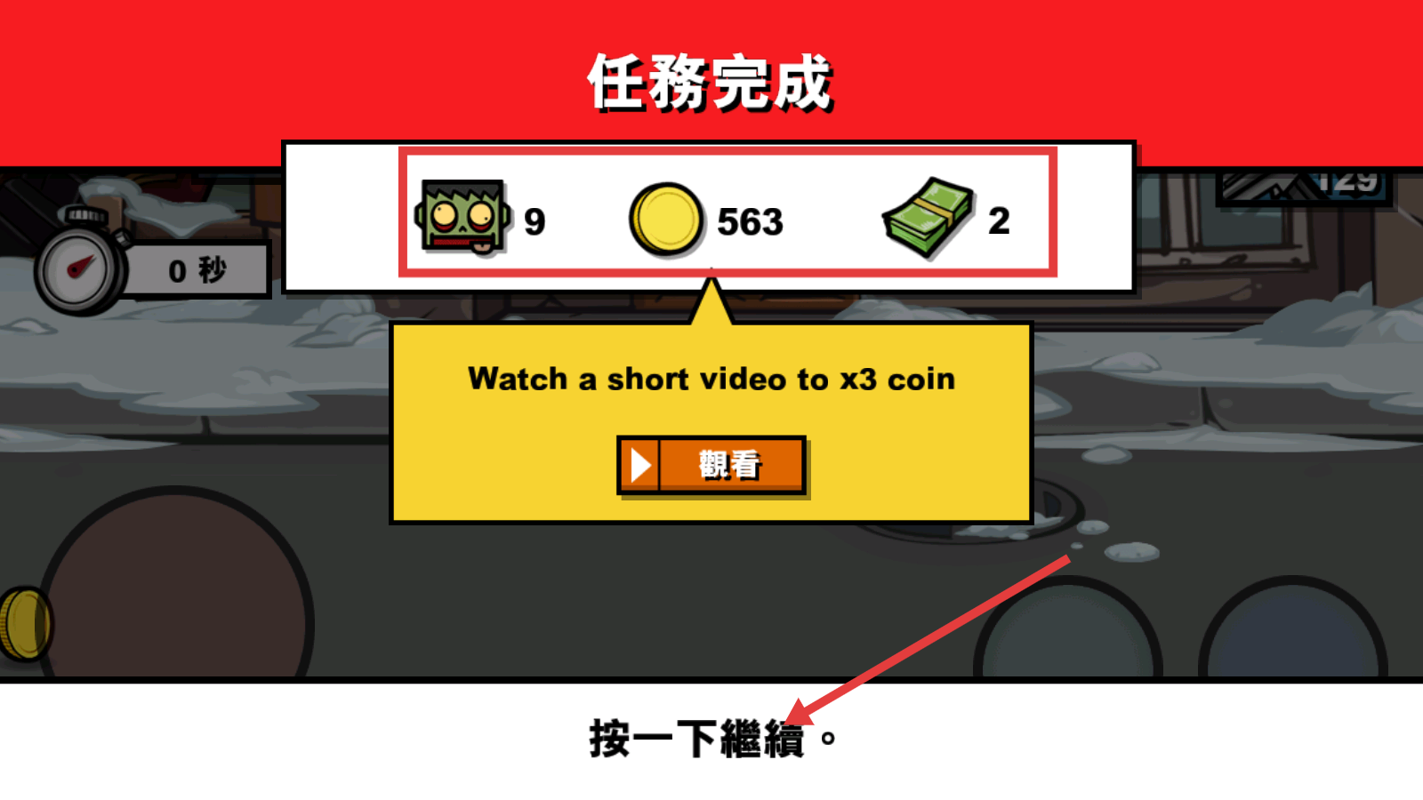 4、任务完成后查看【殭屍9/金币563/钞票2】奖励-可选看广告翻倍金币,或直接点【按一下繼續】结算。