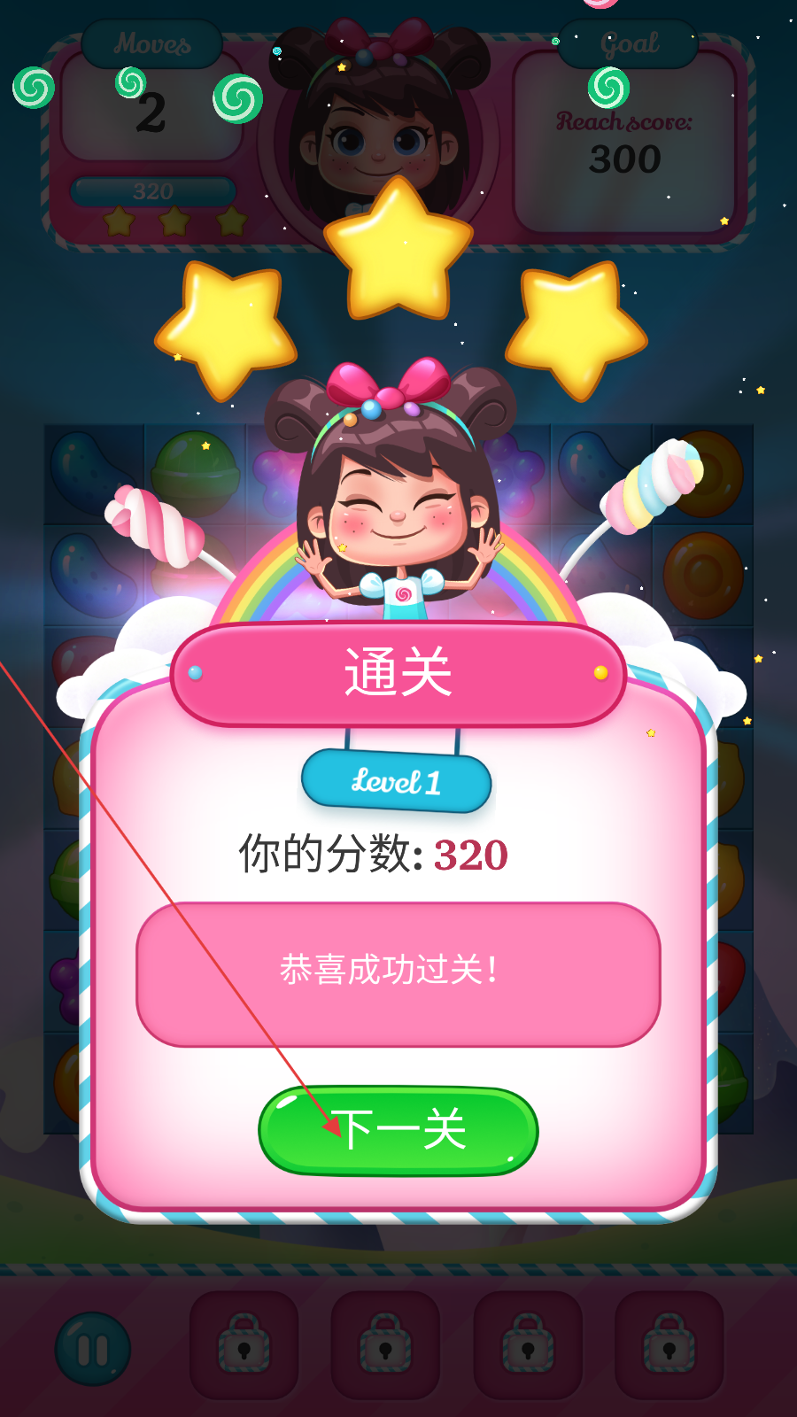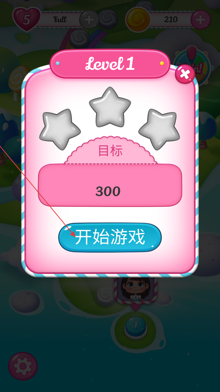 1、打开游戏开心糖果消消消,点击【开始游戏】,进入level1关卡。