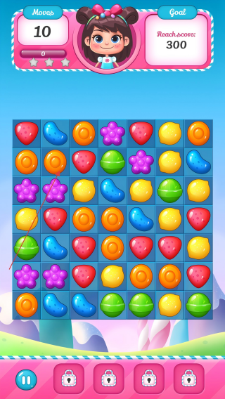 2、在糖果棋盘,滑动相邻同色糖果,如橙色圆形,触发消除得分。