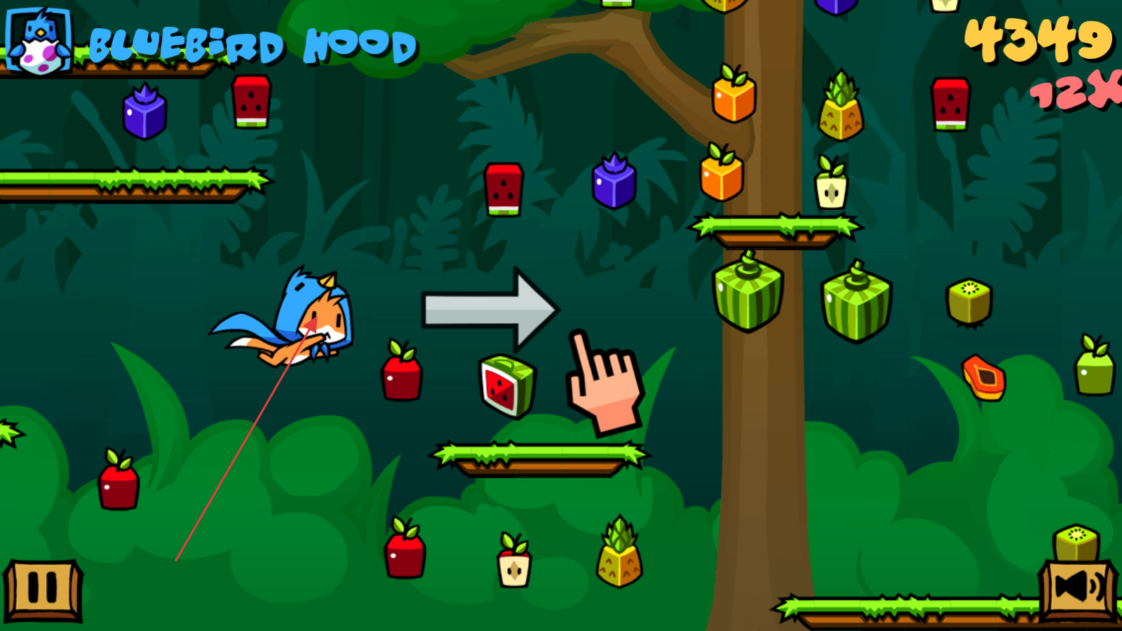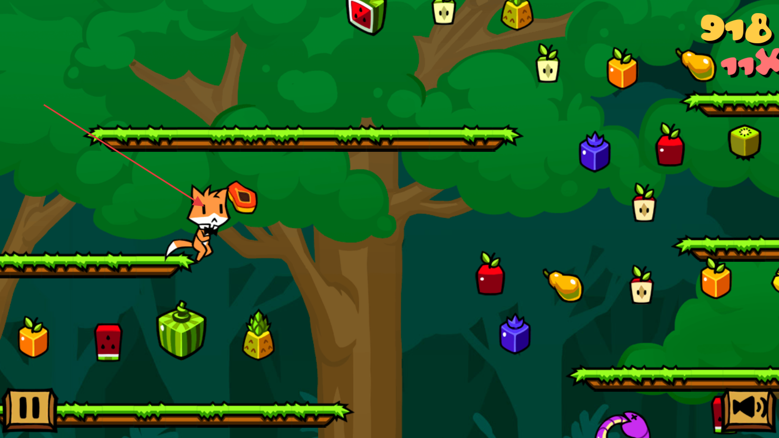 2、在丛林关卡,点击屏幕让狐狸跳跃,躲避障碍、收集水果道具。