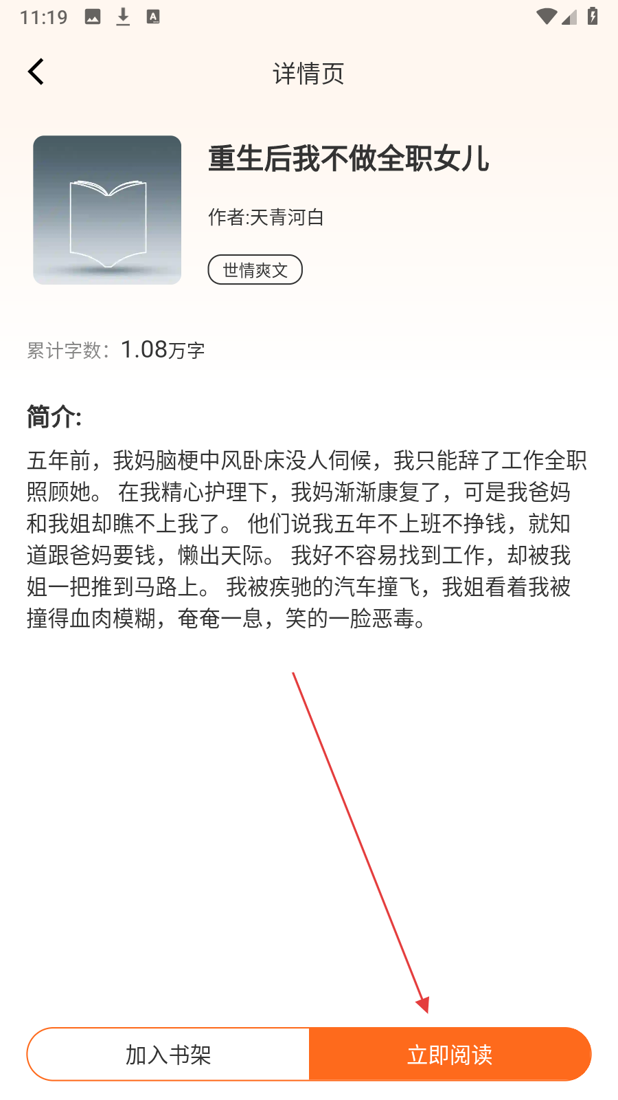 3、在详情页,点击【立即阅读】,开启小说阅读体验。