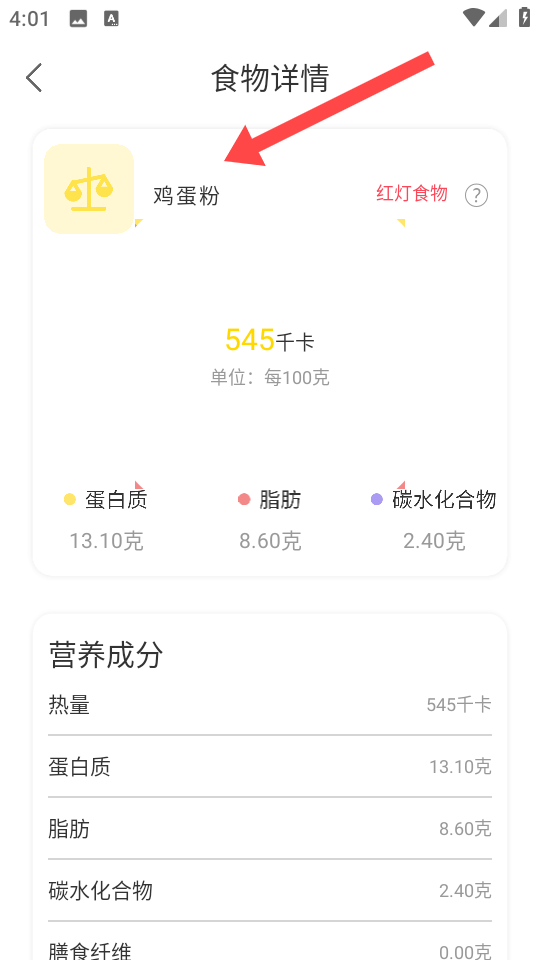 4、在详情页查看热量、营养成分等信息,完成热量查询。
