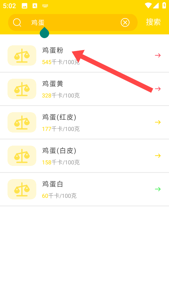 3、接着在搜索结果列表中,选择我们的目标食物,点击进入【食物详情】页。