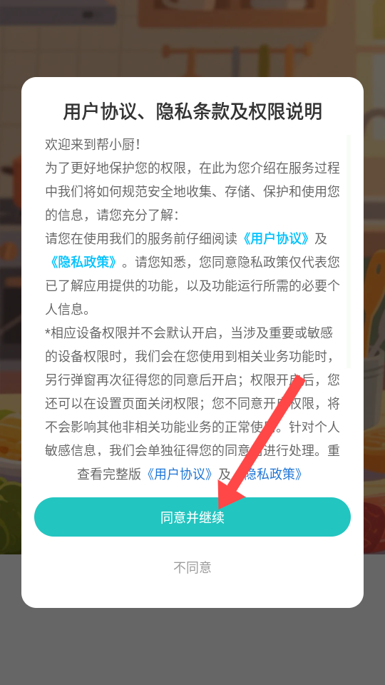 1、点击【同意并继续】,接受协议进入帮小厨首页。